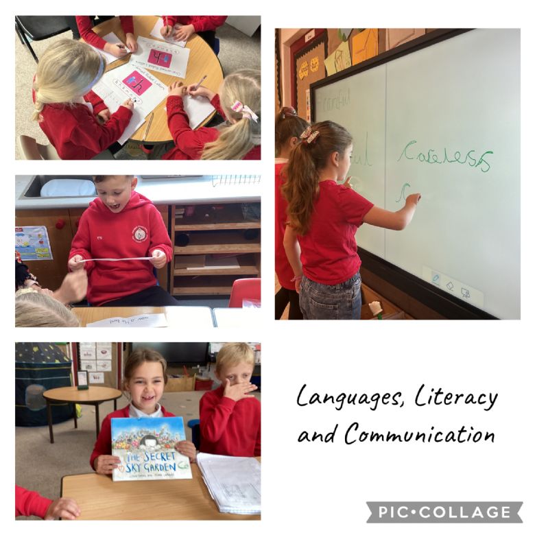 This term, we’ve loved exploring The Secret Sky Garden and learning all about its inspiring message. The children wrote wonderful character descriptions and even sent persuasive letters to the council asking for more flowers and trees in Penclawdd! We’ve also been exploring Welsh through Welsh identity–themed collages, practising oracy, recreating Welsh monuments using construction materials and templates, playing traditional Welsh playground games, and exploring where we live in Welsh. In SPaG and phonics, we’ve been practising capital letters, full stops, and sounding out tricky words to make our writing even stronger.