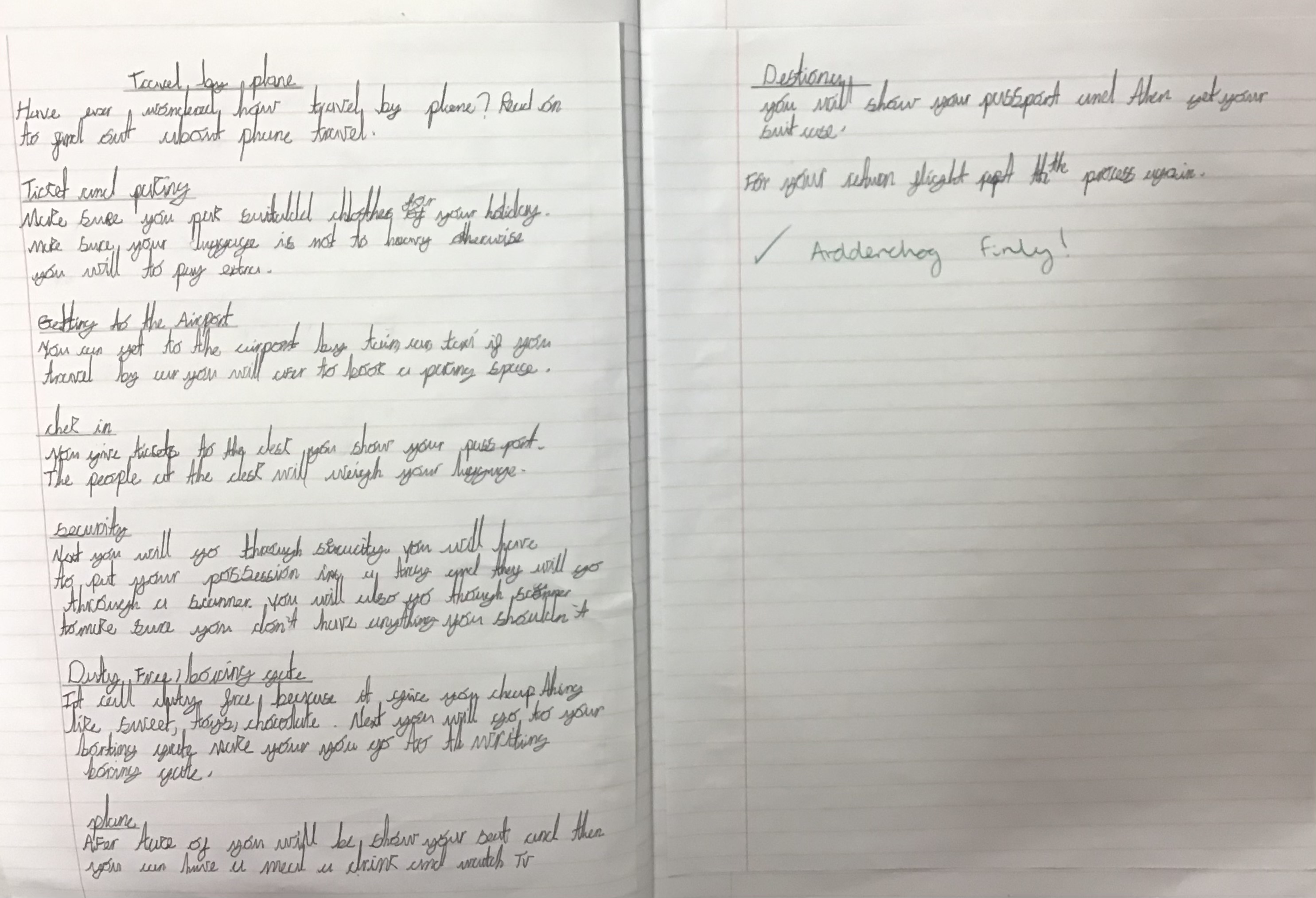 For our writing, we wrote an explanation about how to travel by plane. We had to find out lots of key vocabulary for this. We used Pie Corbett strategies to help us learn sentence patterns before writing our individual texts.