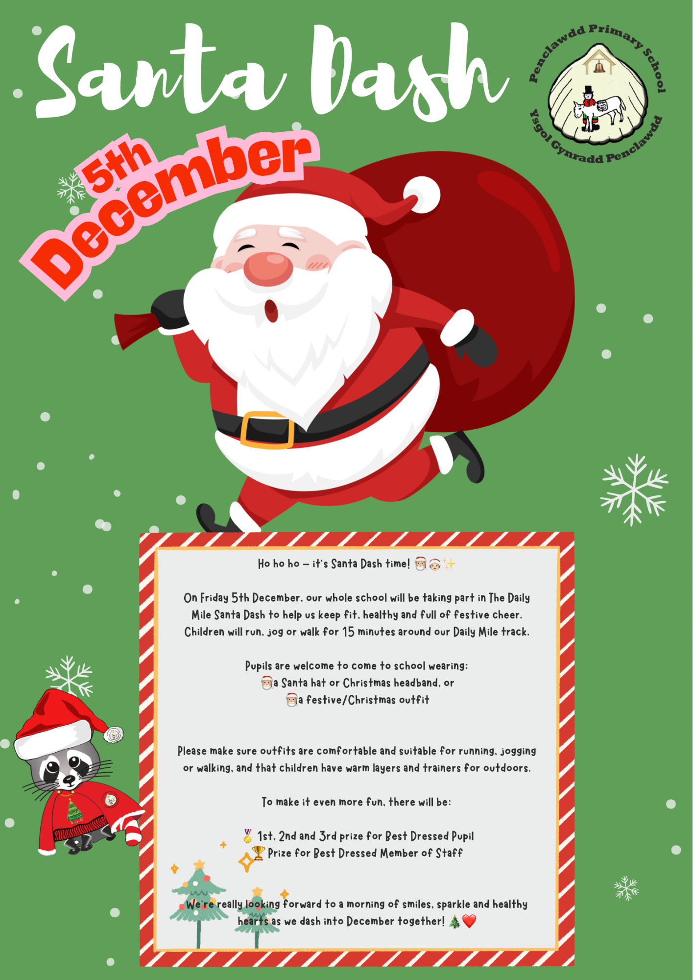 We’re getting festive and active! On Friday, 5th December, our school will be taking part in the Daily Mile Santa Dash. Pupils will enjoy a fun run or walk around the school grounds while wearing something Christmassy – think Santa hats, tinsel, or festive jumpers!